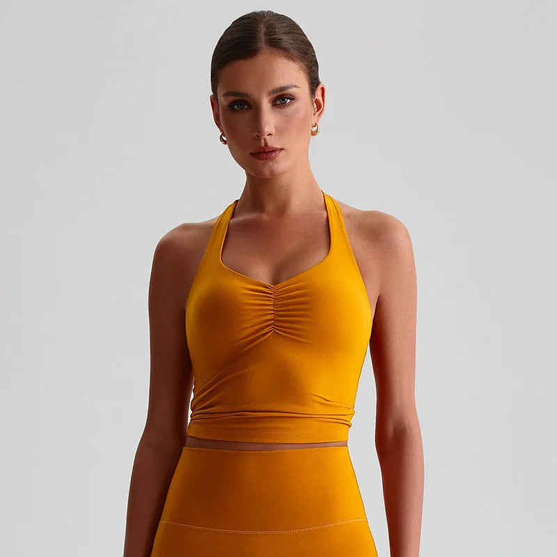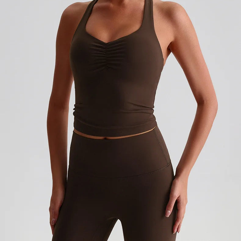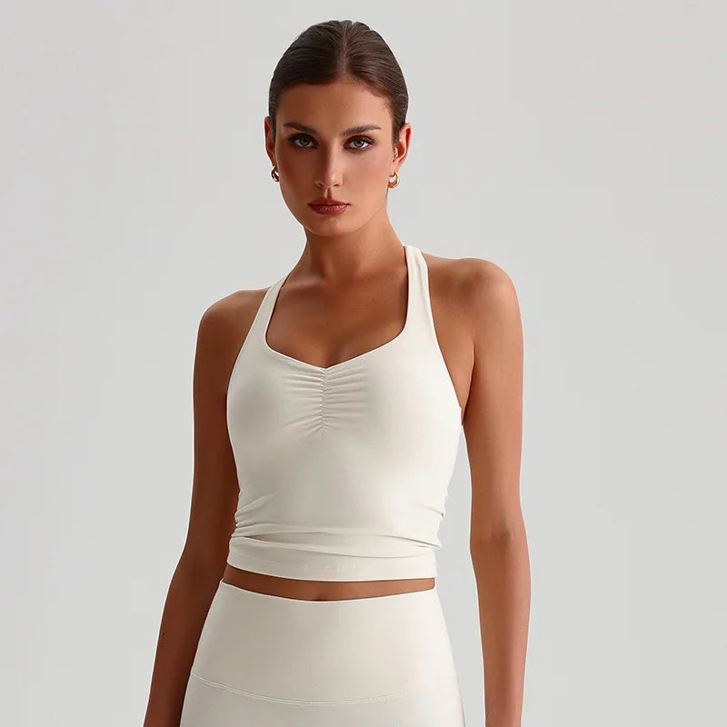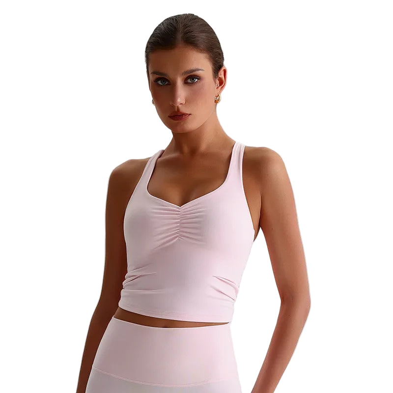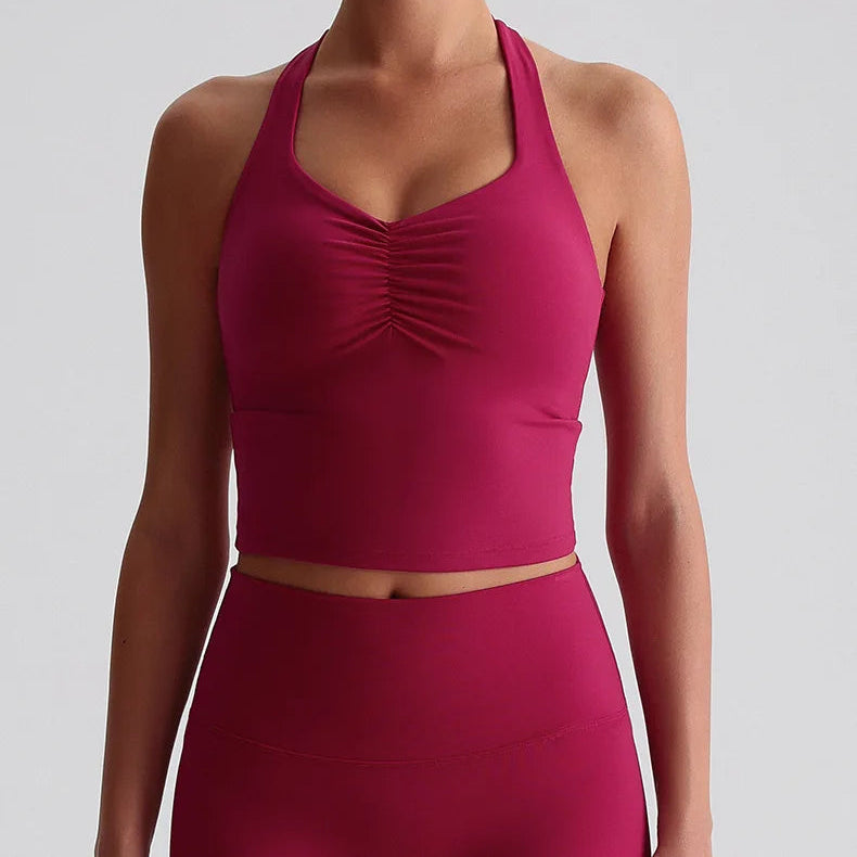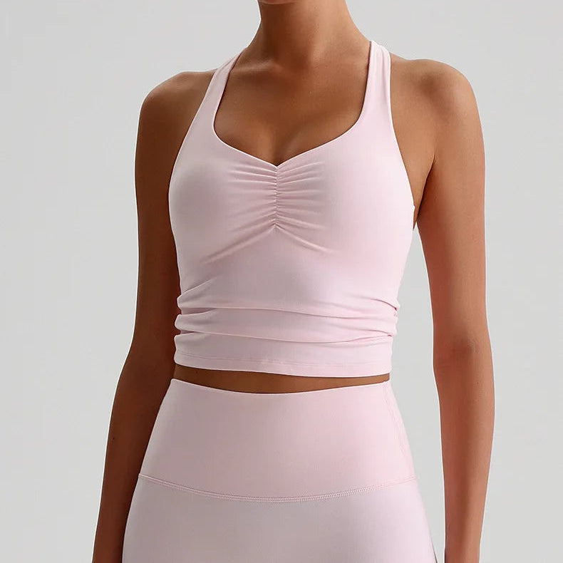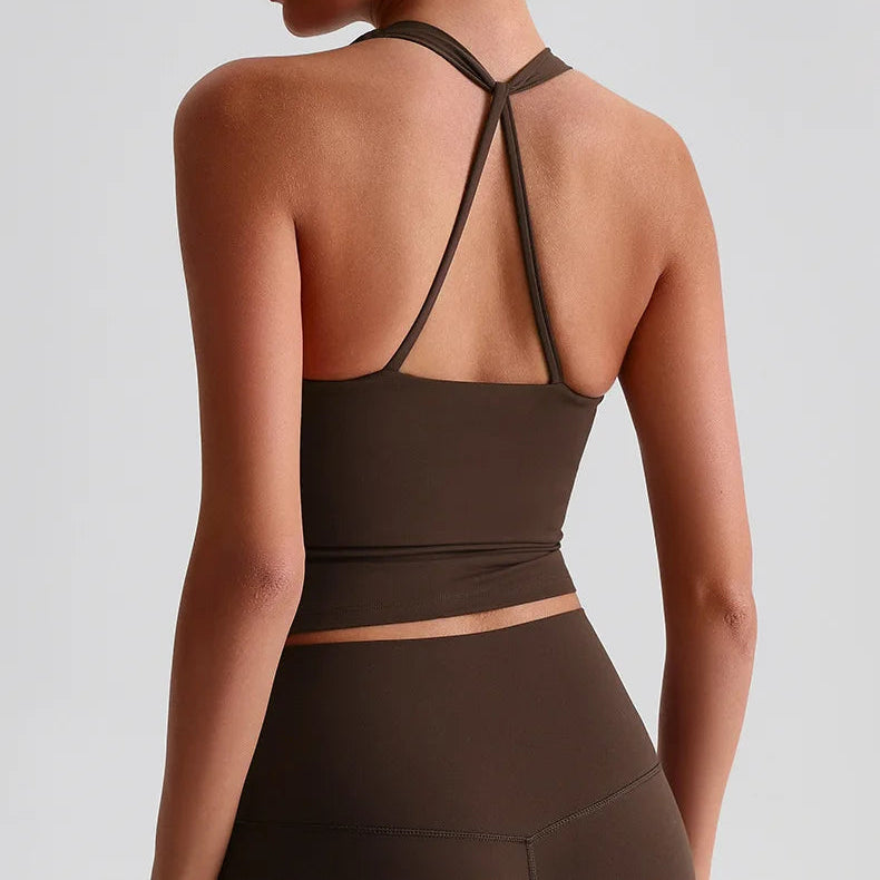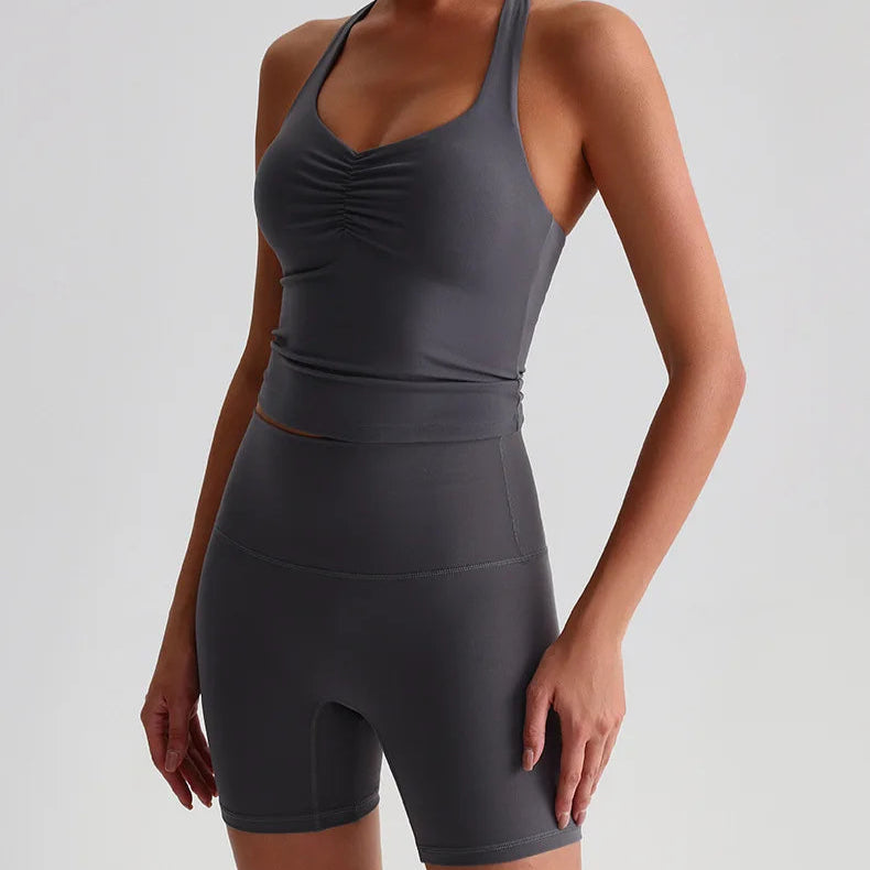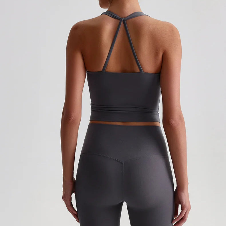 Den integrerte sports-BH-en med polstrede cuper gir høy støtte og minimerer bevegelser under selv de mest intensive øktene. Den kryssede ryggdesignen fordeler vekten jevnt, gir ekstra stabilitet og fremhever samtidig en sporty, feminin look. Stoffet er mykt, elastisk og svettetransporterende, noe som holder deg komfortabel og tørr gjennom hele treningen.