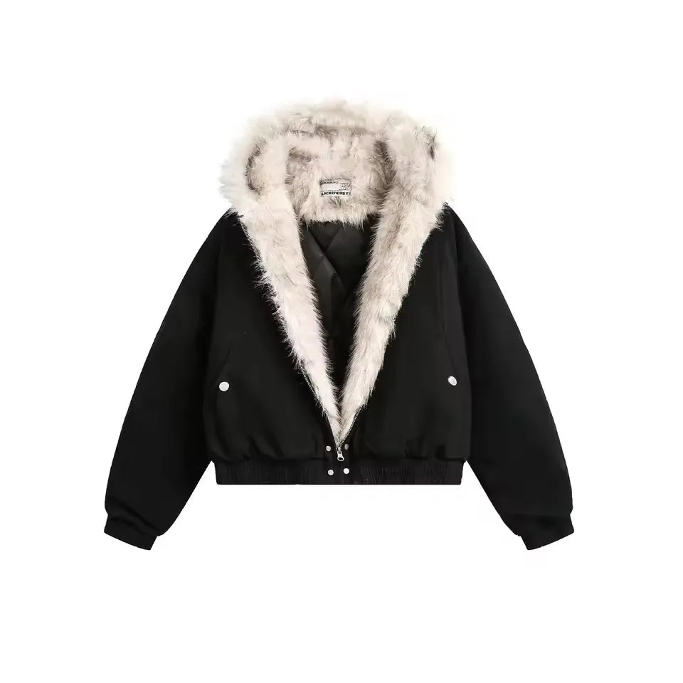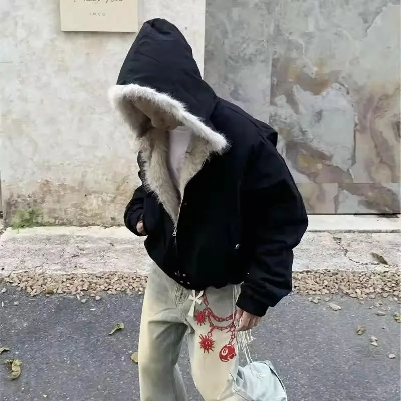 Unisex Vinterjakke med Fuskepels – Retro Hettejakke i Myk Bomull | Varm, Løs & Trendy Jakke for Par og Streetwear-entusiaster