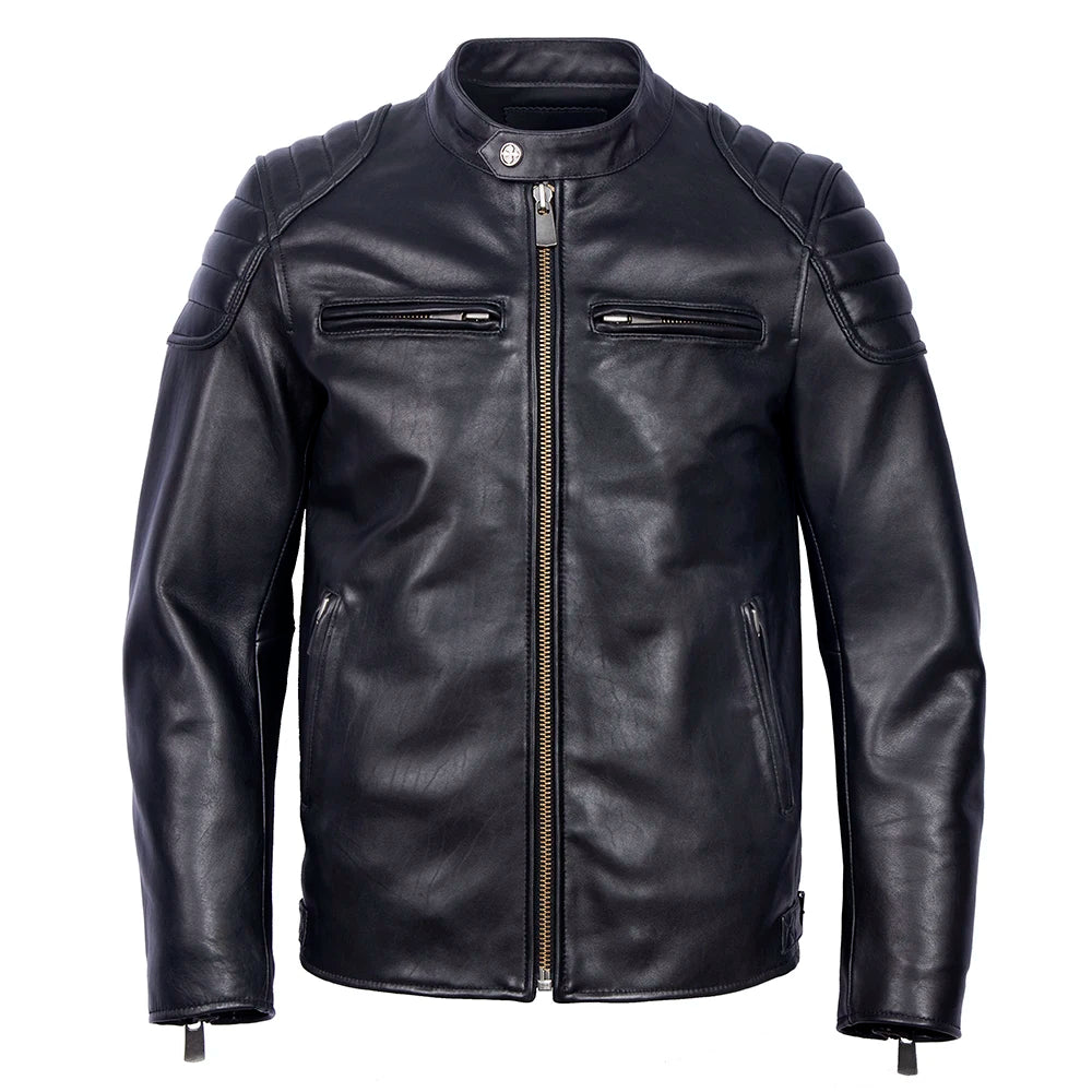 Med klassisk glidelåslukking, krage med knapp og diskrete lommer, passer den perfekt både til hverdagsantrekk, motorsykkelbruk eller en kveld ute.